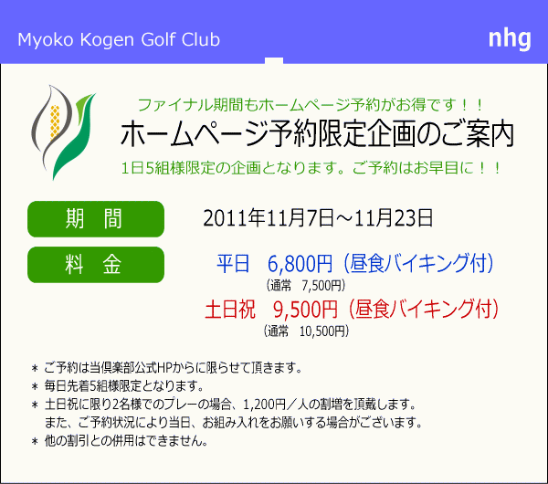 ファイナル期間もHP予約がお得です!! Author ブログ担当 Date 2011年10月21日 こんにちは(^-^) 紅葉も見ごろとなってきましたよ。 お天気の良い日は紅葉を楽しみながらのゴルフ最高ですね!! 11月はファイナル期間ということで11月7日以降さらに料金がお安くなります。 プラスHPからご予約していた